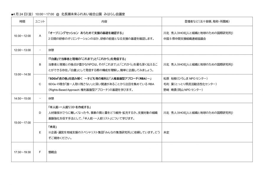 ※より充実した研修にするためにその他の団体にも協力を申請中です。確定次第、追記いたします。